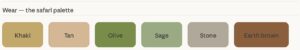 The safari palette is your friend — khaki, tan, olive, sage, stone, and earth browns. These tones blend into the savanna, don’t attract insects, and reflect heat better than dark colors. Most safari outfitters default to these for good reason.