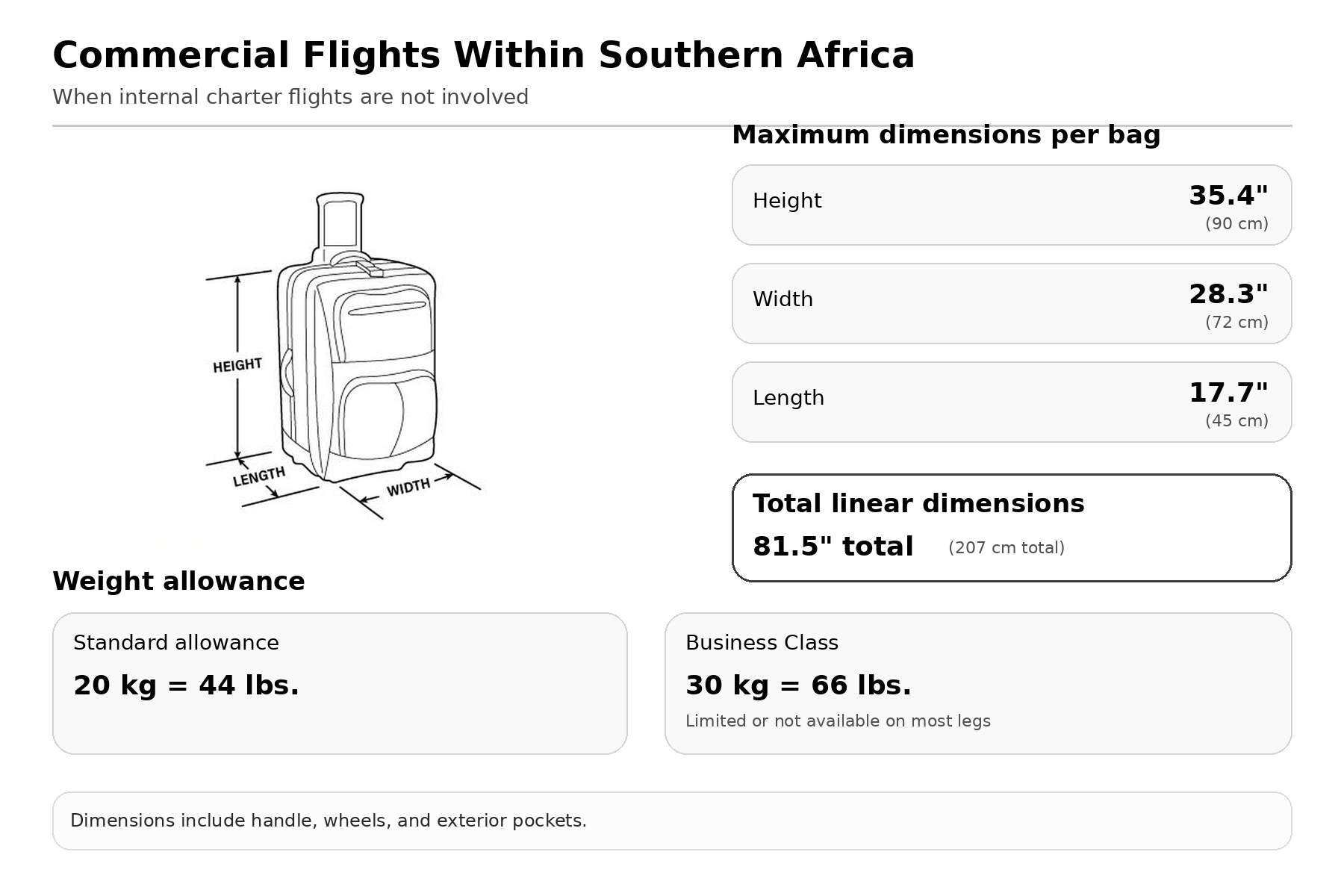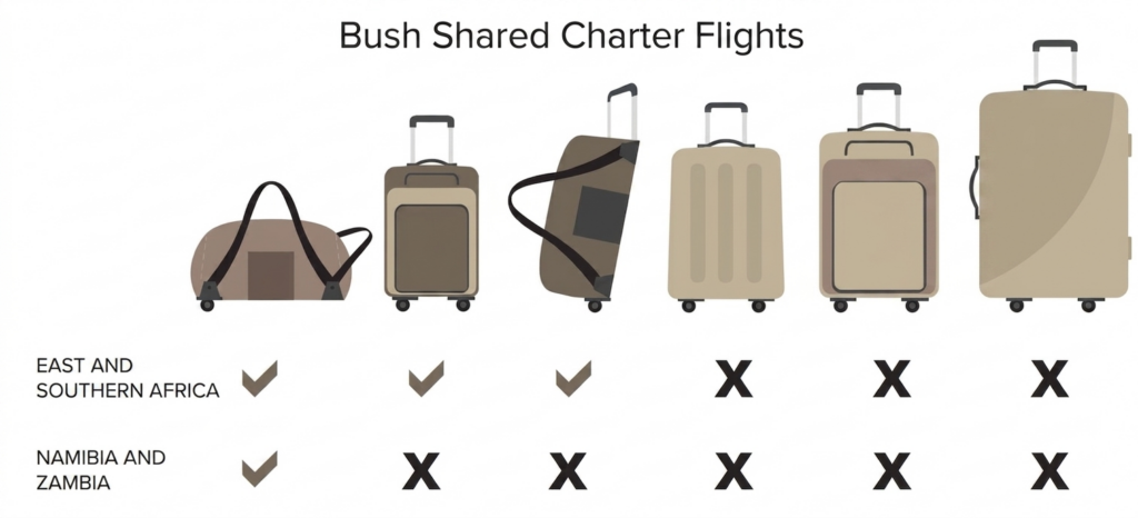 Note that Commercial Flights within Southern Africa Differ…However, if even one leg of your trip is on a shared charter, you should pack to the lower charter baggage limit and type of bags for the full safari, unless you are backtracking and have arranged storage for excess luggage.